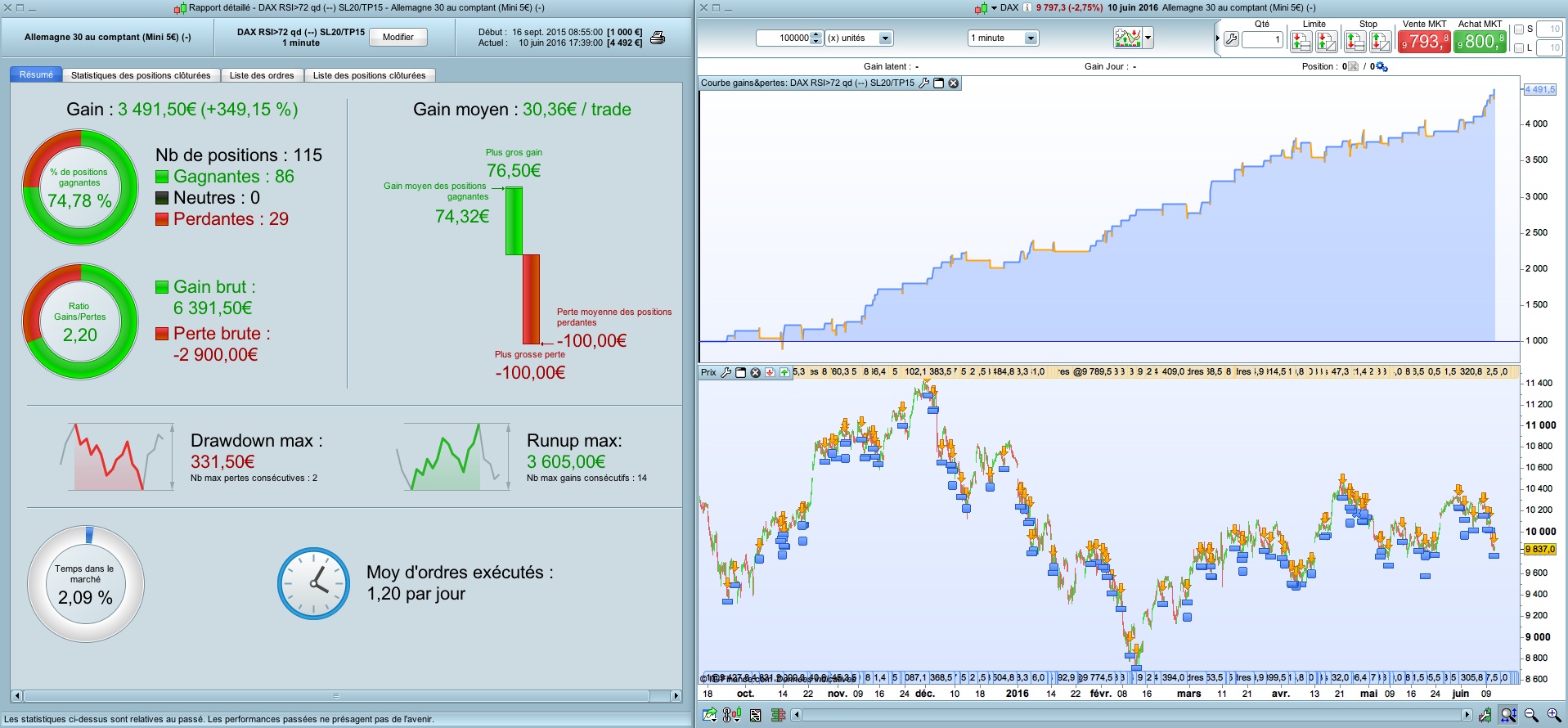 C’est un système très simple sur IG DAX 5€ qui fonctionne en réel depuis début mai sans surprise par rapport au backtest, car je suis sur UT 1M donc peu de chance d’avoir SL et TP sur la même bougie. Le programme tourne simultanément sur mes comptes démo et réel, et à part un slippage de temps en temps, je n’ai pas de différence. (spread à 1)