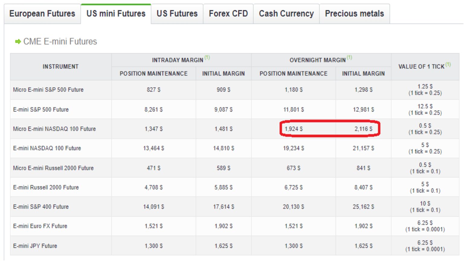 Regards JaapThe (overnight) margin for 1 Micro NQ is 2105 USD