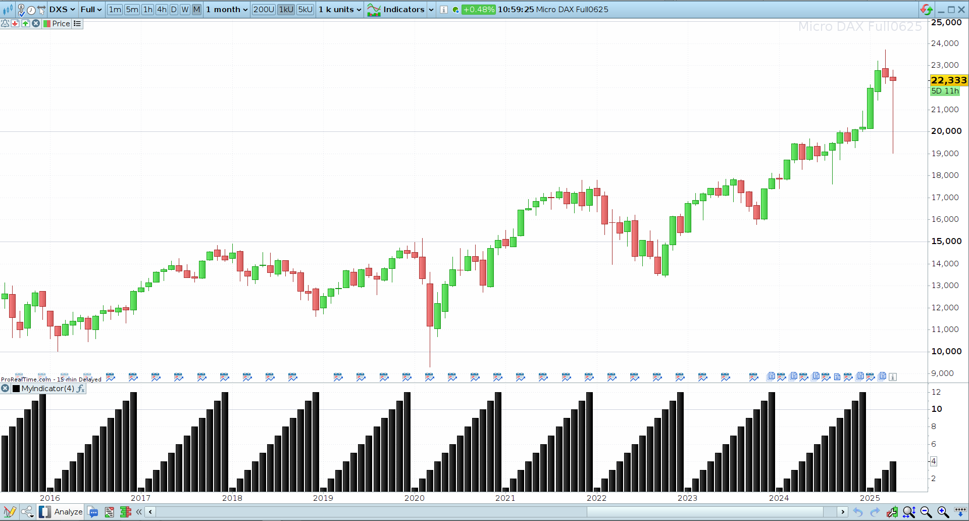 Hi. So, it is for the DAX. I show a monthly chart for reference, and the “MyMonths” indicator I programmed only consist of 1 line, being “Return Month” on a new panel. I circled in red where the months do not display correctly. Also added some drawings. I did not indicate all the incorrect values, but you should get a good idea…. Also, the “printing” function is not an exact duplicate of what I see on the screen, so some of the writings I did are a bit obscured, but the overall picture should come accross.