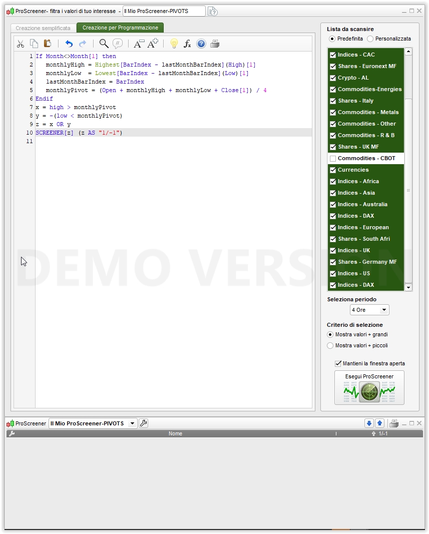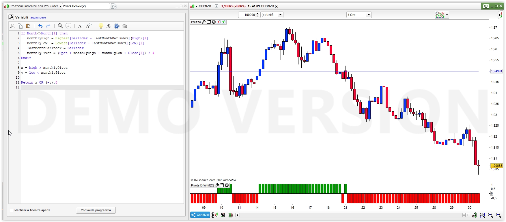 Ok, there is no mean to have directly the monthly pivot, but the code above allow to calculate it (i’m not sure for the open price). once the monthly pivot calculated, i would like to display it with the last code line (SCREENER[c1] (mPivot As “% mPivot”).