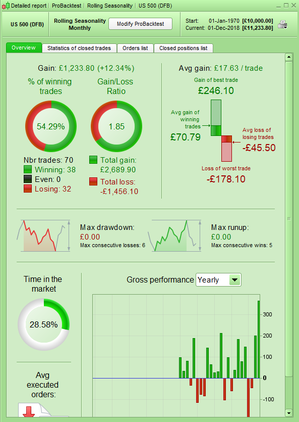 The results seem to conclude that all time seasonality is worth using as our win rate has increased from 64% to 74%, our gain/loss ratio from 1.50 to 2.52, our average return per trade from £8.69 to £39.51 and the consecutive losers has dropped from 5 to 3. Our total amount won has increased from £1243 to £2094.