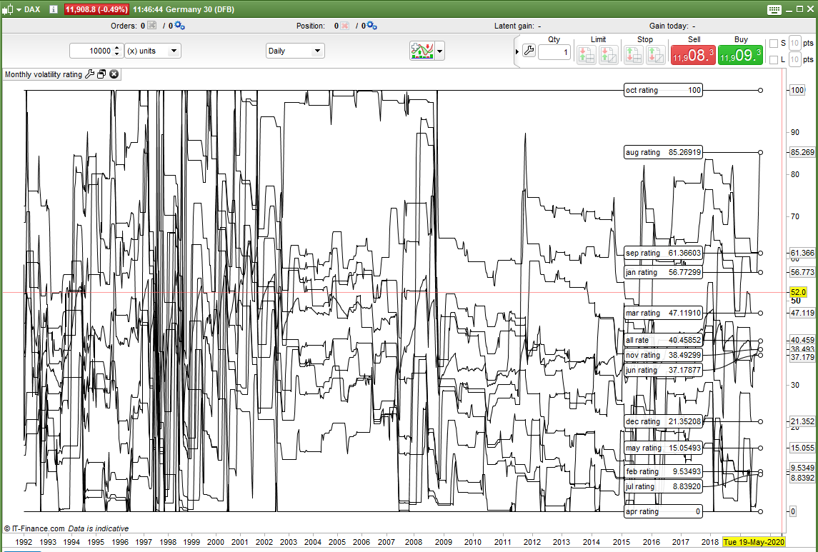 In the attached image of the DAX daily we can see that October is the most volatile and April the least volatile. January, March, August and September are above the average volatility and all the other months are below it. How far above and below in relation to the other months can be easily seen thanks to the 0 to 100 rating.