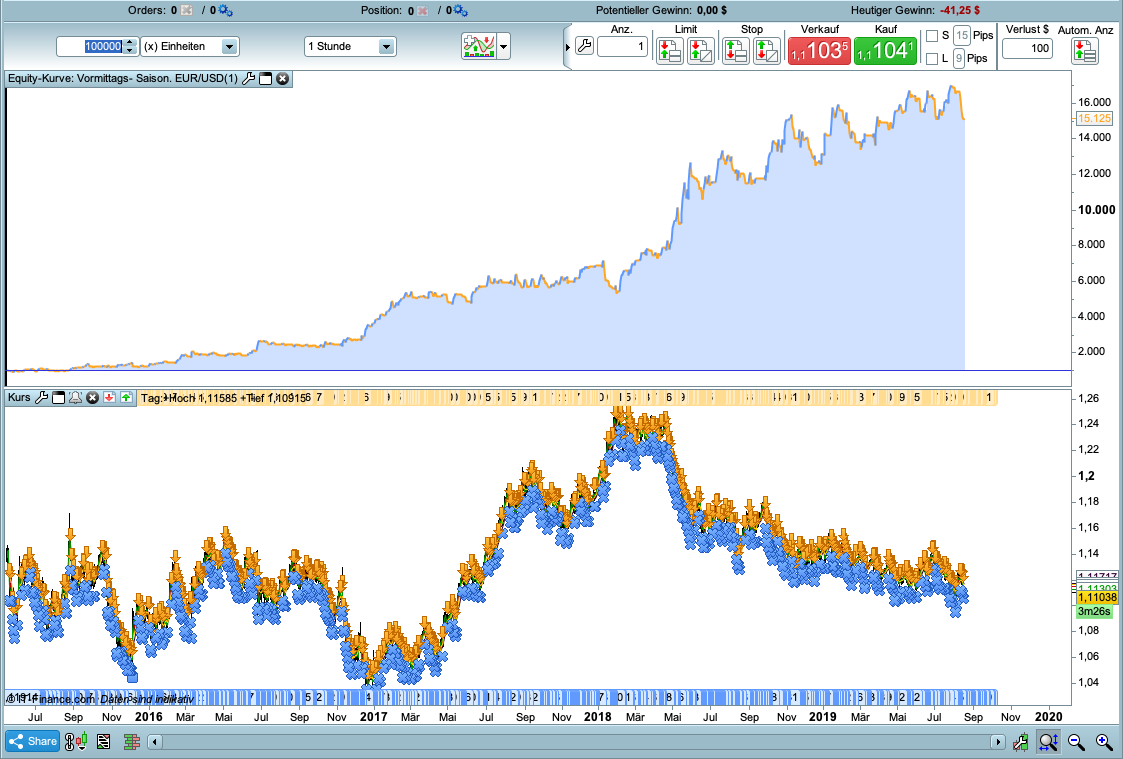 I would like to introduce a very nice and simple strategy. Unfortunately it is not mine. I found it on https://www.trading-treff.de/wissen/handelsstrategie-fuer-daytrader-im-eurusd-backtest-inklusive and rebuilt it once. It just make Short-Trades, because Long-Trades would increase the Equity curve. As you can see, it works quite well (Spread: 1). If someone can test it for a longer period of time, that would be nice. If someone had an idea to minimize the drawdowns a bit, it also would be nice.