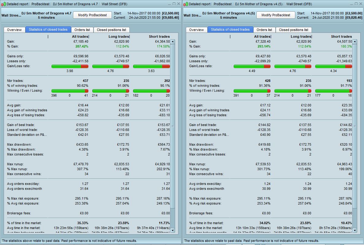 Attached you can see the modified version on the right, a small improvement in return and quality metrics. I will keep on with long and short for now to see how it goes. I understand why you would go for long only though, I ended up doing that on another of my DJI strategies. I think the Fed is seen by US investors as a backstop to any downside so the sell offs tend to be short lived making short trades somewhat problematic.