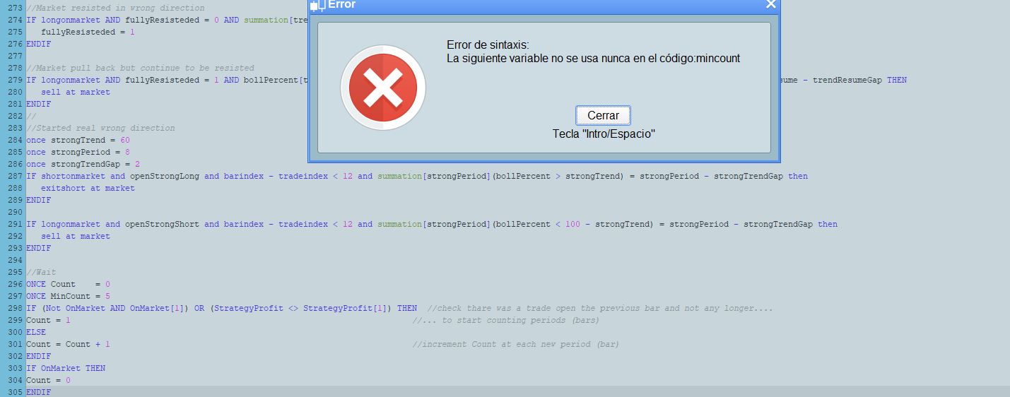 1234567891011 //WaitONCE Count = 0ONCE MinCount = 5IF (Not OnMarket AND OnMarket[1]) OR (StrategyProfit <> StrategyProfit[1]) THEN //check thare was a trade open the previous bar and not any longer….Count = 1 //… to start counting periods (bars)ELSECount = Count + 1 //increment Count at each new period (bar)ENDIFIF OnMarket THENCount = 0ENDIF