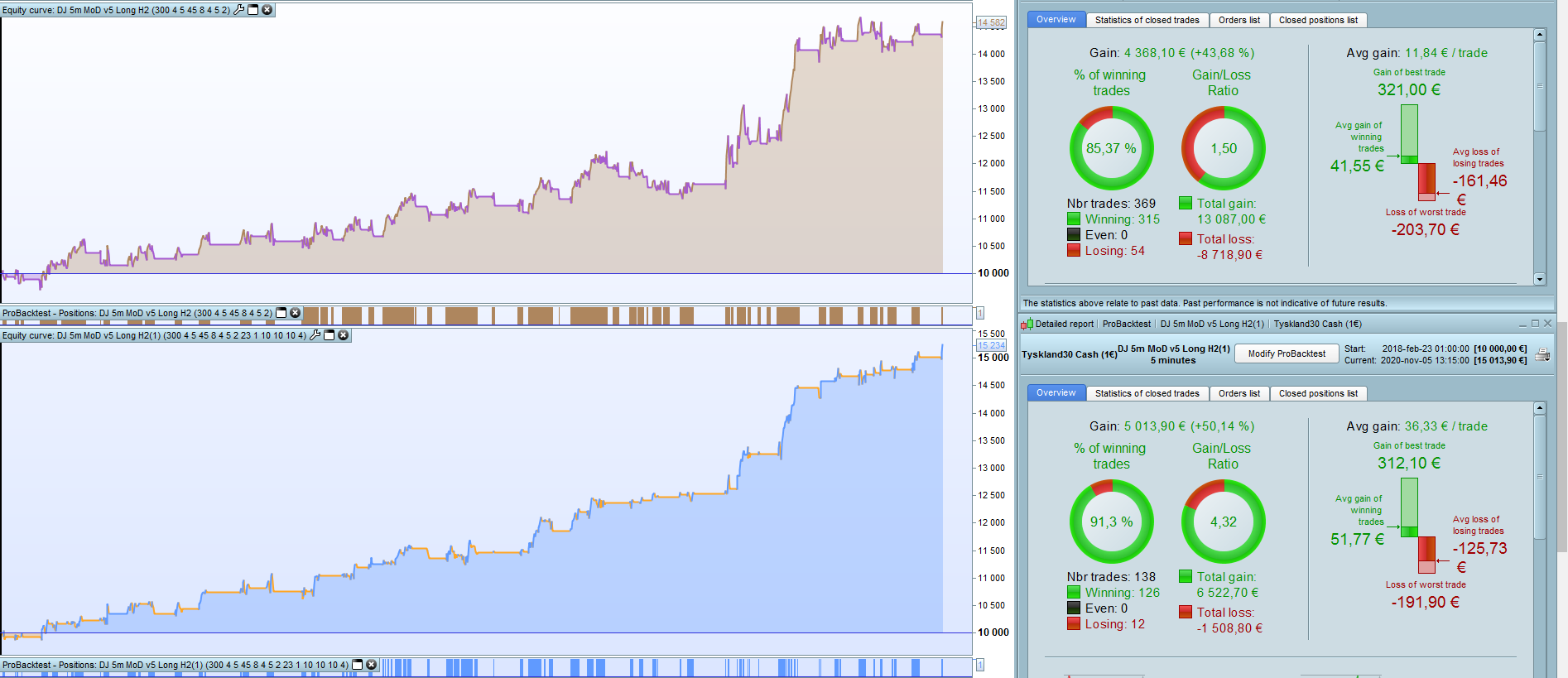 The first one(the one on top) I tried to optimize for high WF and many trades (85.37% winrate, 369 trades)