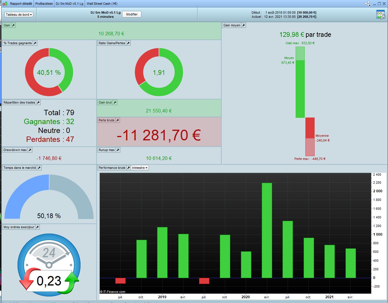 The other big difference is the time in the market : 25% time with some hours by trade in the original code against 41% time and 4 days by trade in the new version. That’s with there is not so much trade in the new code. The trades stay more time in market to get the 2.6% take profite.