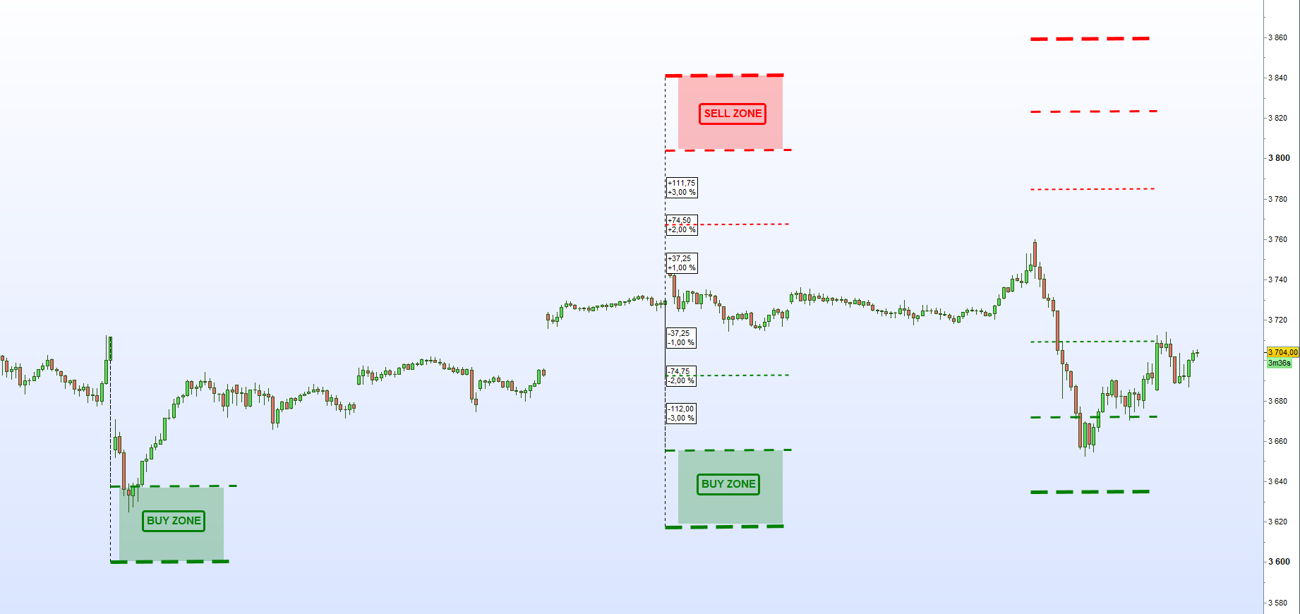 lines that are +/-1%, +/- 2% and +/-3% of the previous day’s close.