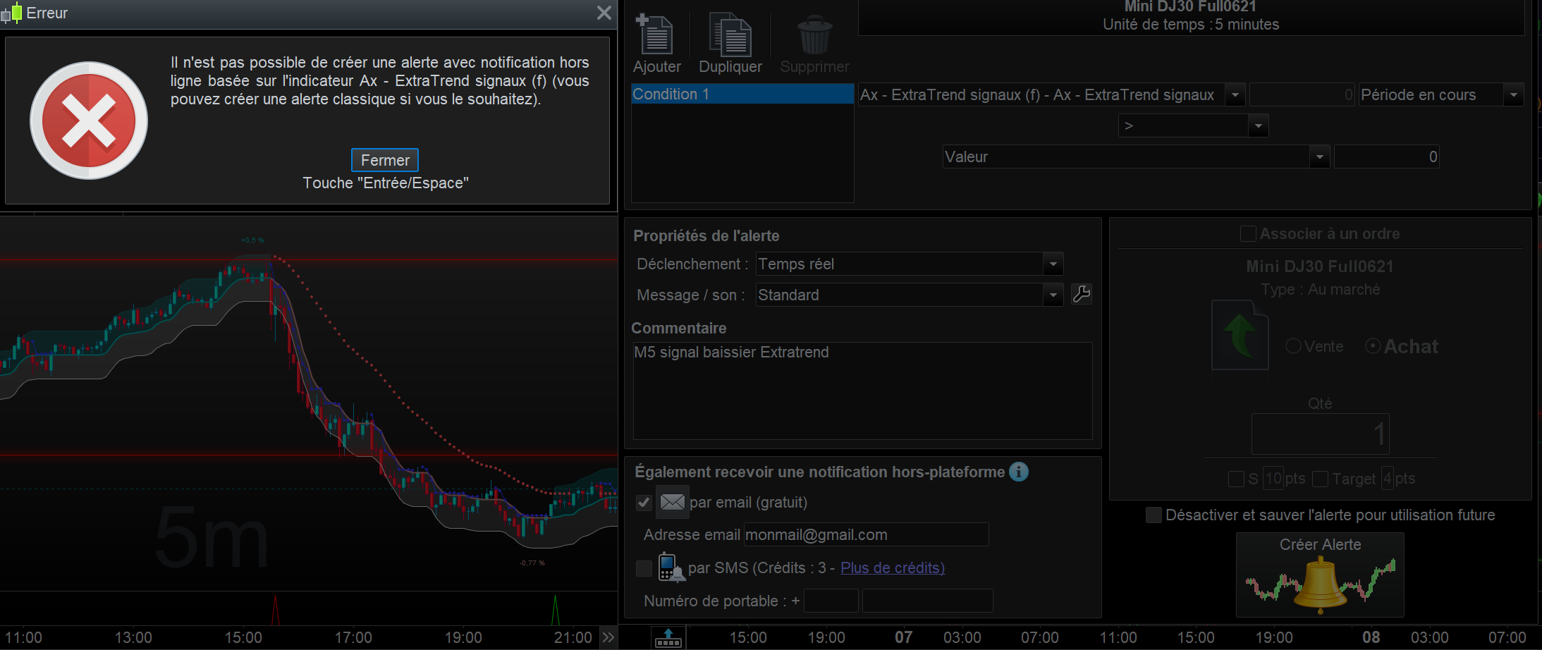 Je souhaiterais recevoir un alerte par mail lors du déclenchement d’un signal d’indicateur mais j’ai un message d’erreur lors de la création de cette alerte.