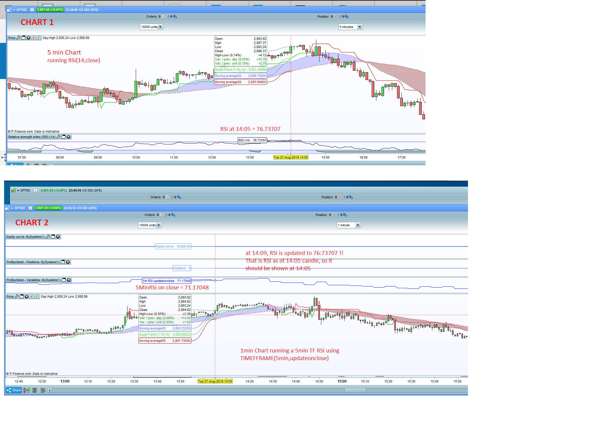 On the 2nd chart you have the equivelent 5m RSI updateonclose running on 1 min candles and if you pick the exact same 5 min point in time as the 5 min indicator so in this case 14:05 the “5m RSI updateonclose” = 71.17048. Surely that should read 76.73707 as at 14:05, that 5 min close is known (which is what the TIMEFRAME(5min, updateonclose is supposed to return) the 5 min candle has closed and it should return what the 5 min RSI has on the 5 min chart which is 76.73707. At 14:05 these two charts should show the same numbers, nut they dont. Like you have seen the 76.73707 is shown at 14:09 which is completely wrong as at that point we are almost closing the 10min candle. Is this a bug in the code, as I cannot understand how this logic is correct?! At 14:05 the 5 min price history is known and so the timeframe function should evaluate the indicator and return it exactly at 14:05 and not a min later.