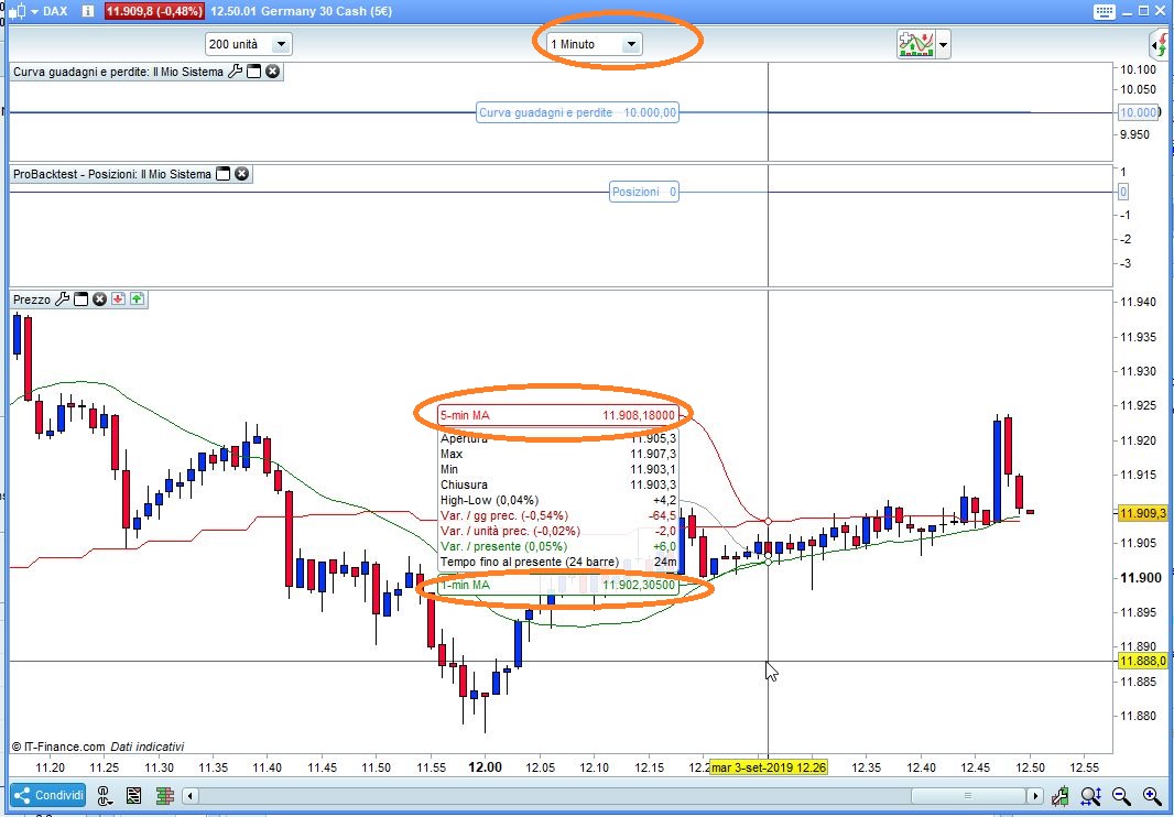 So in your example code you kindly copied here, just compare the “avg1” value (the timeframe(5,updateonclose) running on your 1min chart to the average(20,close) on a separate DAX chart window running 5 min candles. Then pick a point time which appears on both charts eg 12:50 and compare the two values (it will have to be hh:00 or hh:05 or hh:10 or up to hh:55). I am expecting that at 12:50 point in time what your avg1 variable (timeframe(5min,updateonclose)) running on the 1min chart to show the same value as the 5min AVG running on your other separate DAX chart running 5min candles. Don’t look at anytime which is not on the 5min chart eg in your last image you had 12:46 as that time will not be on the 5min chart since that only closes on round 5min intervals. You will see that at 12:50 avg1 will NOT equal the 12:50 average on your 5min chart. That is what I cannot understand.