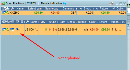 The trade has not been orphaned – well at least that is what the ‘open positions’ window is telling me anyway.