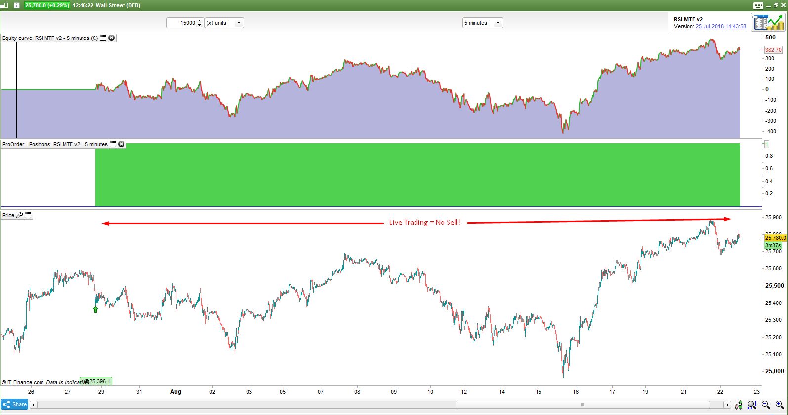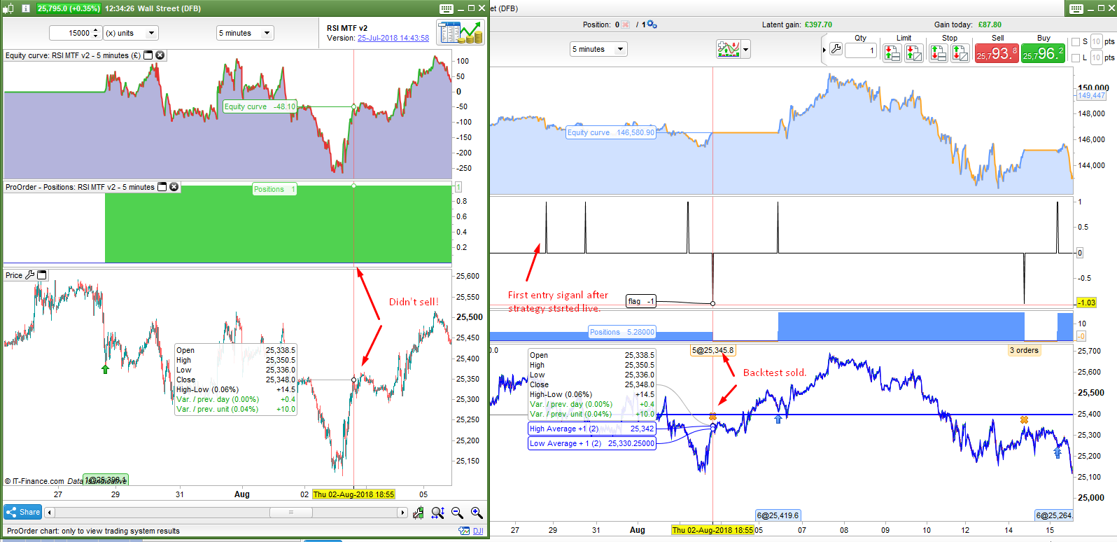 The first MTF strategy that I coded opened a position correctly on 27th July and should have closed it on the 2nd August. When the strategy is back tested the position is closed but the live strategy did not close it. In fact a total of six valid sell signals have been ignored.