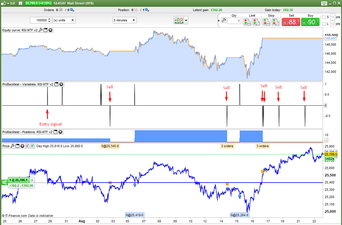 The strategy simply looks at RSI[2] levels on 1 hour, 30 minute, 15 minute and 5 minute time frames. If they are all below a certain level it buys and if they are all above a certain level it sells. It is long only on DJI 5 minute.
