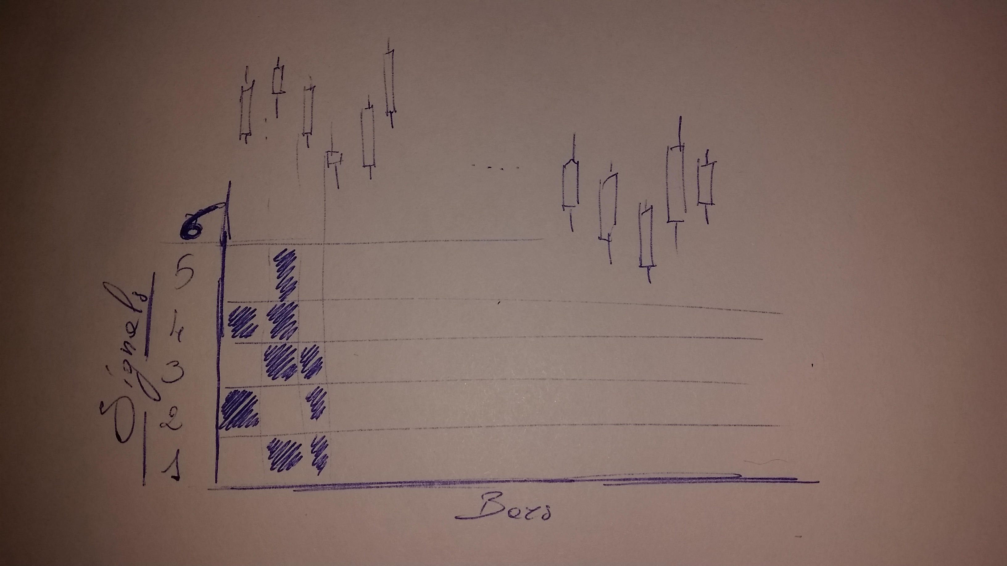 In metro ho fatto uno schizzo. Ve lo allego. Come vedere, pensate di avere n segnali e volete sapere quali di questi n sono verificati per ogni singola barra. Nello schizzo per esempio, in prima barra risultano veri i segnali dei pattern 2 e 4, in barra 2 sono veri i pattern 1, 3, 4 e 5 etc etc …