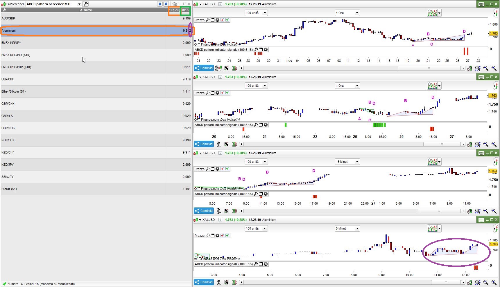 It’s a MTF screener and and a modified ABCD indicator that returns signals only (to be added below the price chart, like Macd, if you like) to be called from the screener, because changing variable names for such a long indicator would take too much time and too many lines to read.