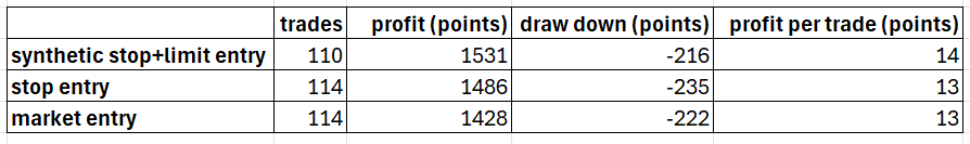 result: 4 entries missed, and impact? – as you see in the excel/printscreed attached: synthetic stop+limit trading still shows best results in terms of total profit, profit per trade and drawdown vs “stop entries” and “market entries”.