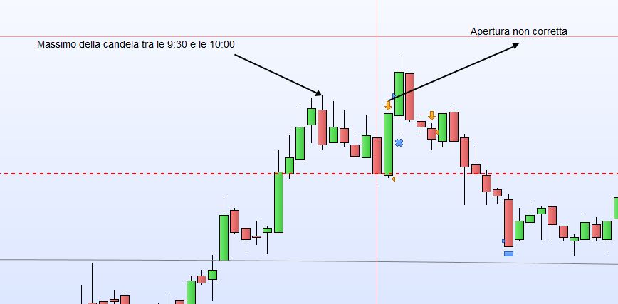 Gent.mi l’idea che ho è la seguente: prendo in considerazione sul time frame a 30 minuti solo quei massimi che superano la banda di bollinger: nell’esempio allegato nel file massimo abbiamo un massimo alle ore 10; il mio punto di partenza è questo, nel senso che se devo fare qualcosa, la faccio dalle 10 in poi e solo short e solo quando il prezzo una volta salito sopra questo massimo lo ritesta. Ora, non potendo automatizzare in un unico time frame (infatti nella candela successiva va sopra e poi riscende, ma con l’unico time frame mi aprirebbe l’operazione alle 11), mi sposto su un time frame più piccolo.