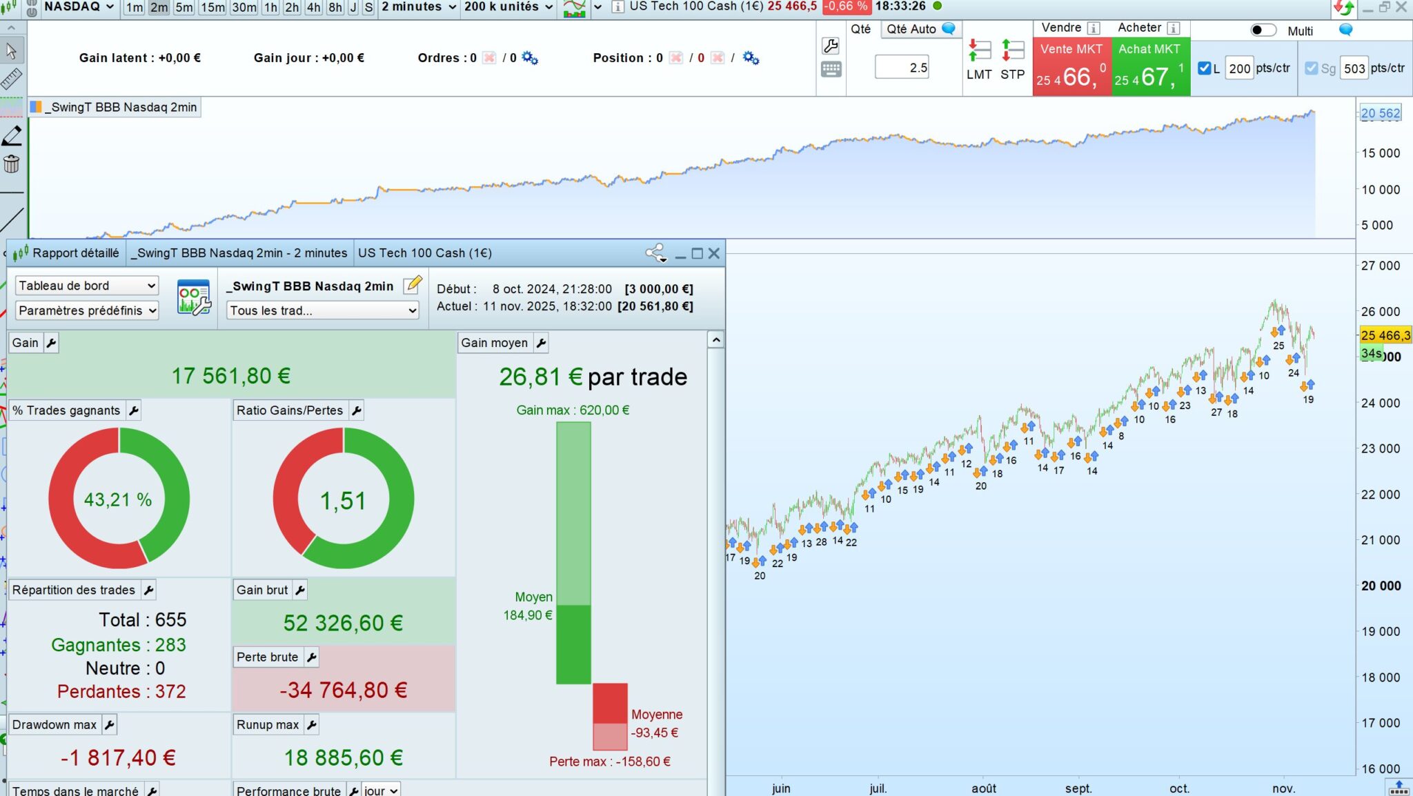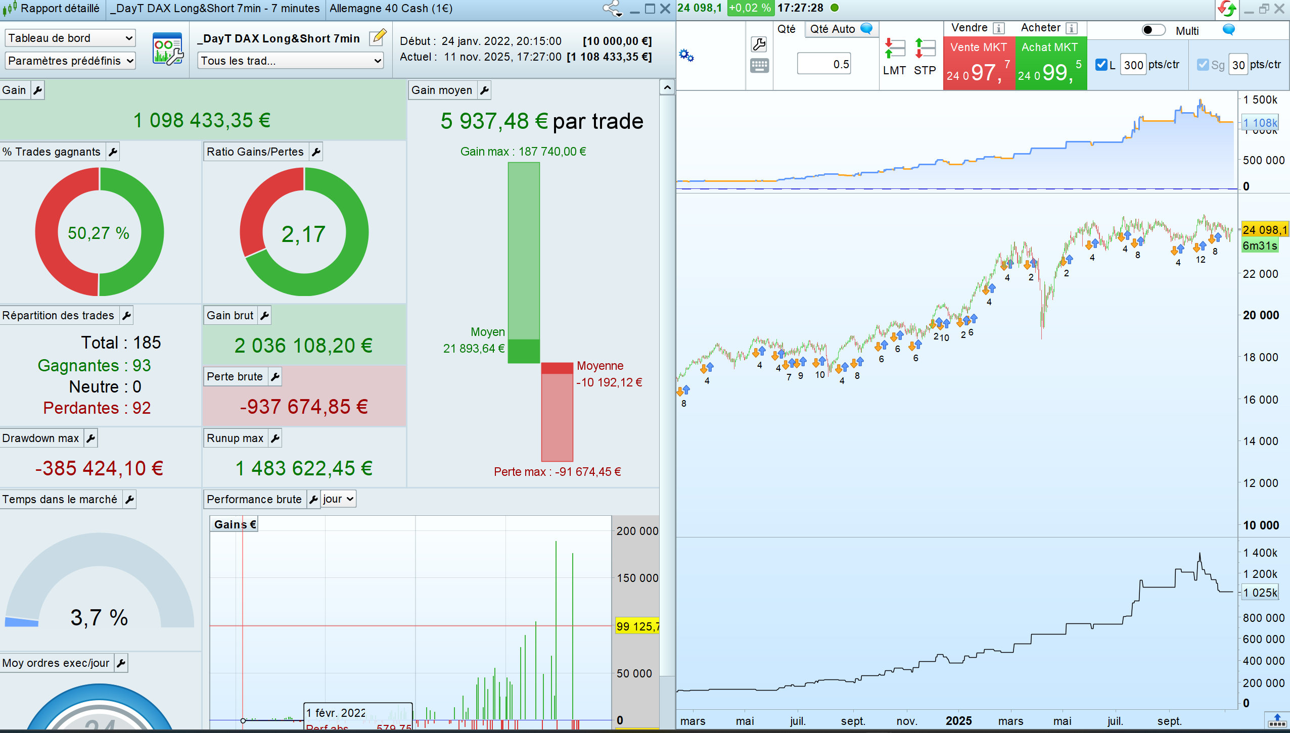 Second one on DAX, 7 min time frame (same strategy : hit an run => stays very few time on market) : from 10k to 1 million in 3-4 years. All the fees (spread and guaranteed stop loss fees are calculated by the code)
