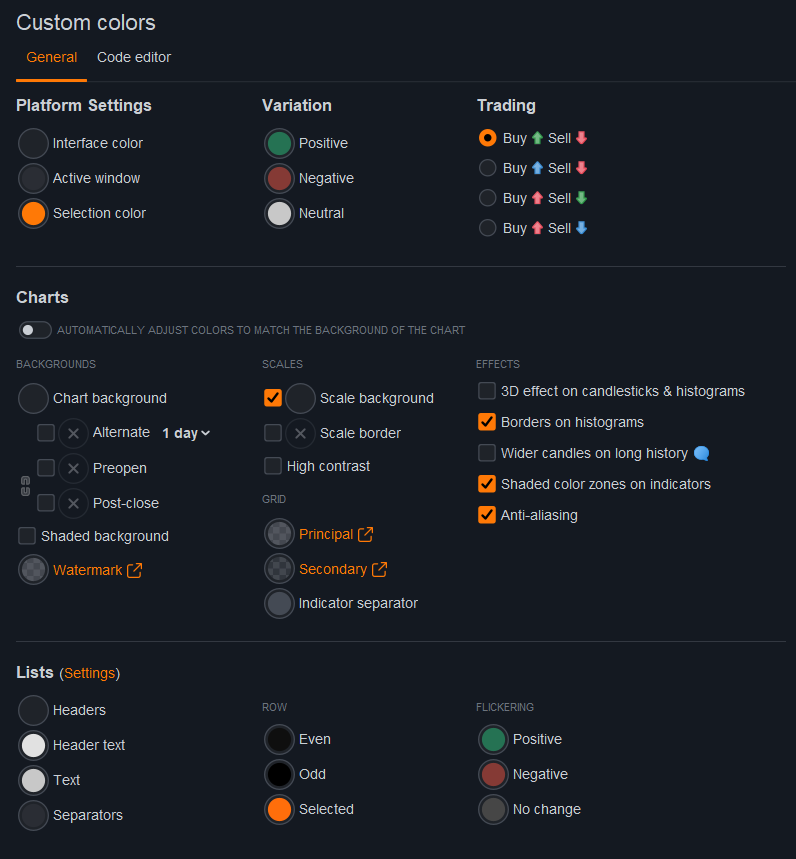 I switched everything to a deep dark grey background, but I used a strong Orange/Amber accent for all the selections and active windows. I find that the orange pops really well against the dark charts, especially for reading the price scales and spotting the selected line in my order lists quickly.