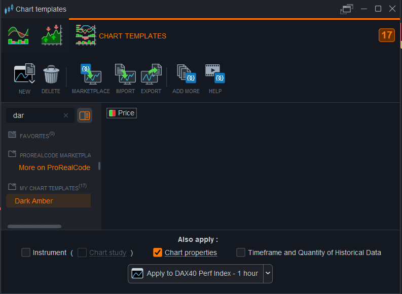 Chart template is the only way to share the custom colors of the platform, so when you apply it on the chart don’t check the options to apply the instrument, chart studies and settings of the instrument.