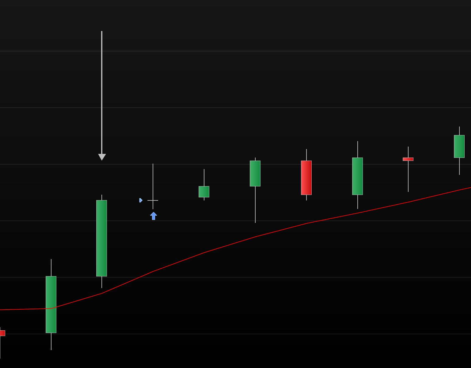 Hier mal anbei ein Screenshot: Der Kauf sollte in der 5min-Kerze mit dem weißen Pfeil ausgeführt werden.