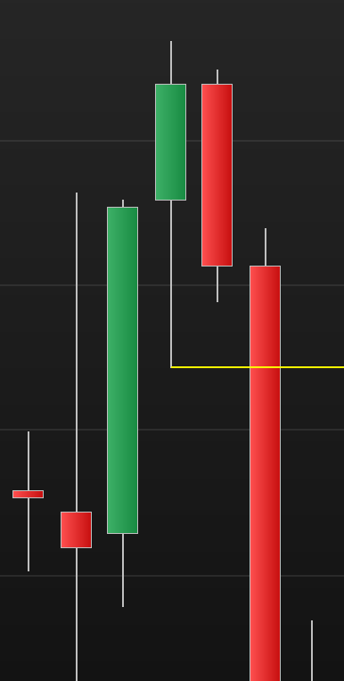 Wie kann ich eine Verkaufsbedingung schreiben, dass die große rote Kerze während sie das Low der höchsten grünen Kerze (gelbe Linie aus dem Bild) nach unten crossed sofort einen Verkauf auslöst. – Nicht erst bei der nächsten Kerze.
