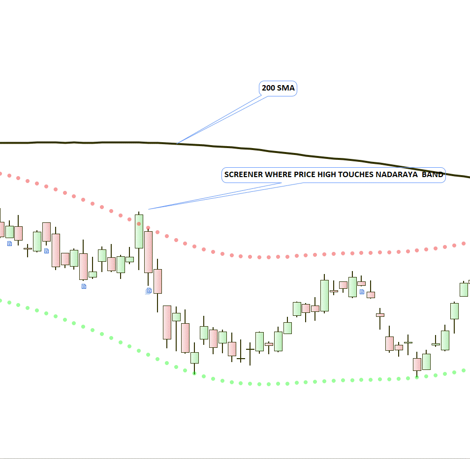 I have this code below for Nadaraya Watson Indicator, I would like to make a Screener out of it. I want price to be below 200 SMA and price (high) to touch the Nadaraya top(high). Please see below:
