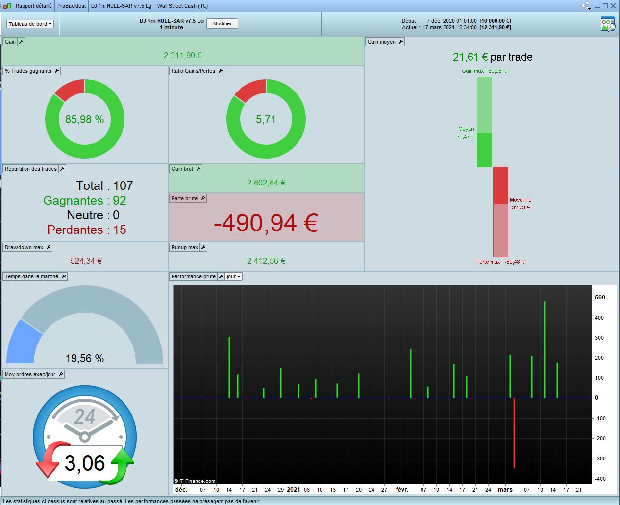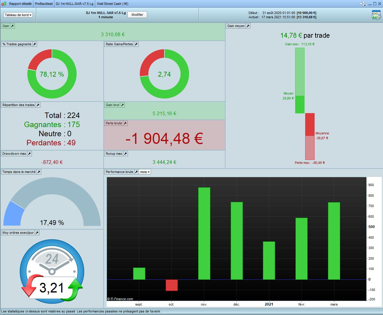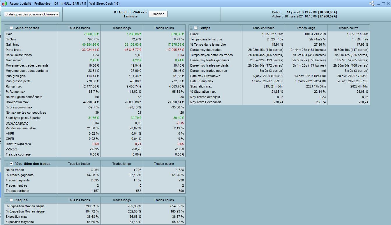 I did a test 1M on DJ 1 min HULL-SAR 7.5. This was good during crisis but very average before and after (since november 2020). We also can observe the code is quite good in Long but not in short