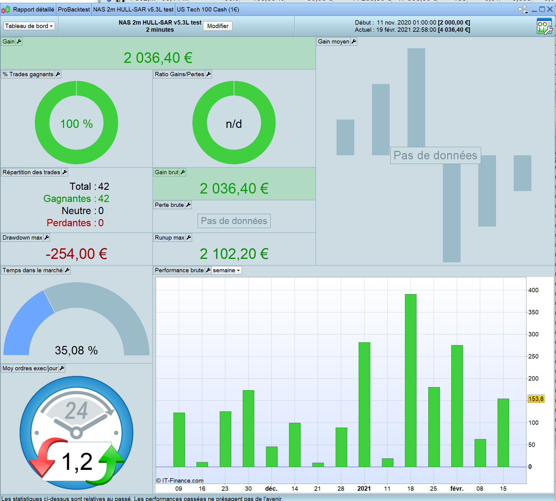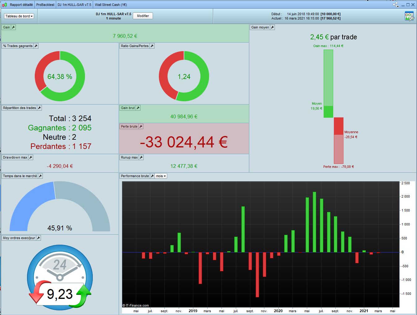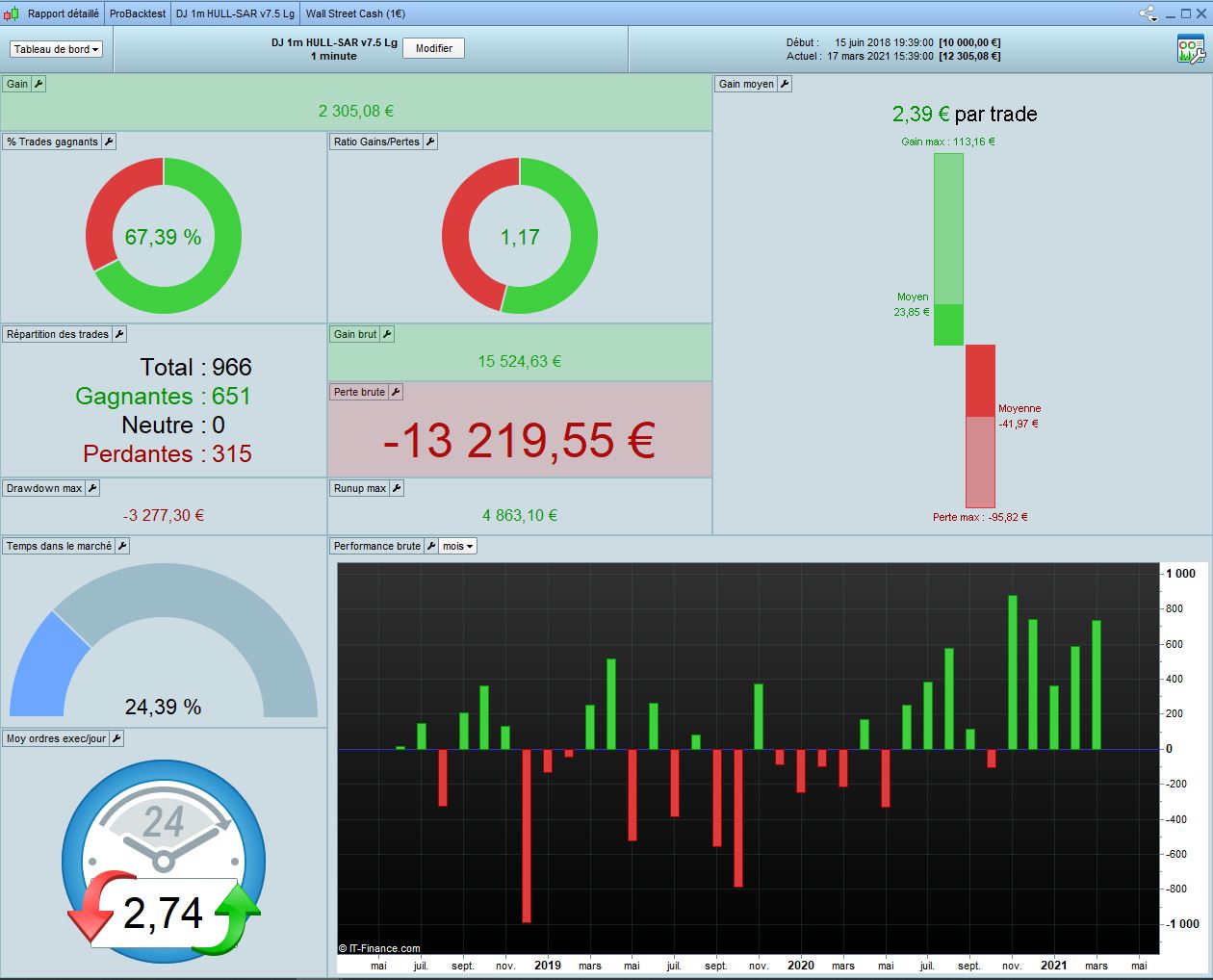 I did a test 1M on DJ 1 min HULL-SAR 7.5. This was good during crisis but very average before and after (since november 2020). We also can observe the code is quite good in Long but not in short