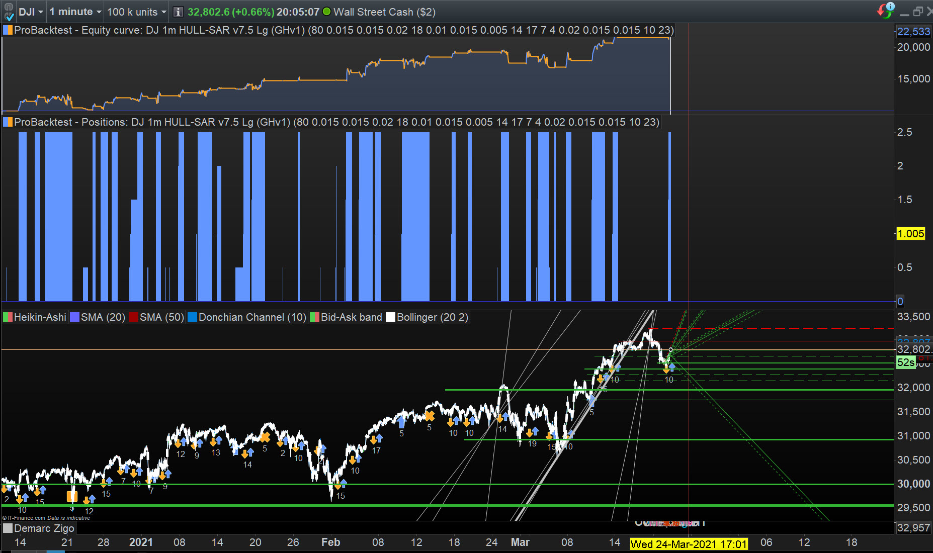 The MM code is fine, but you have to change the settings according to what leverage you get. To the best of my knowledge, the IG margin rate for the DJ is 5% (everywhere except Switzerland). You can check this by clicking on Info>Margin Requirements on the deal ticket. This means the MM code should look like this: