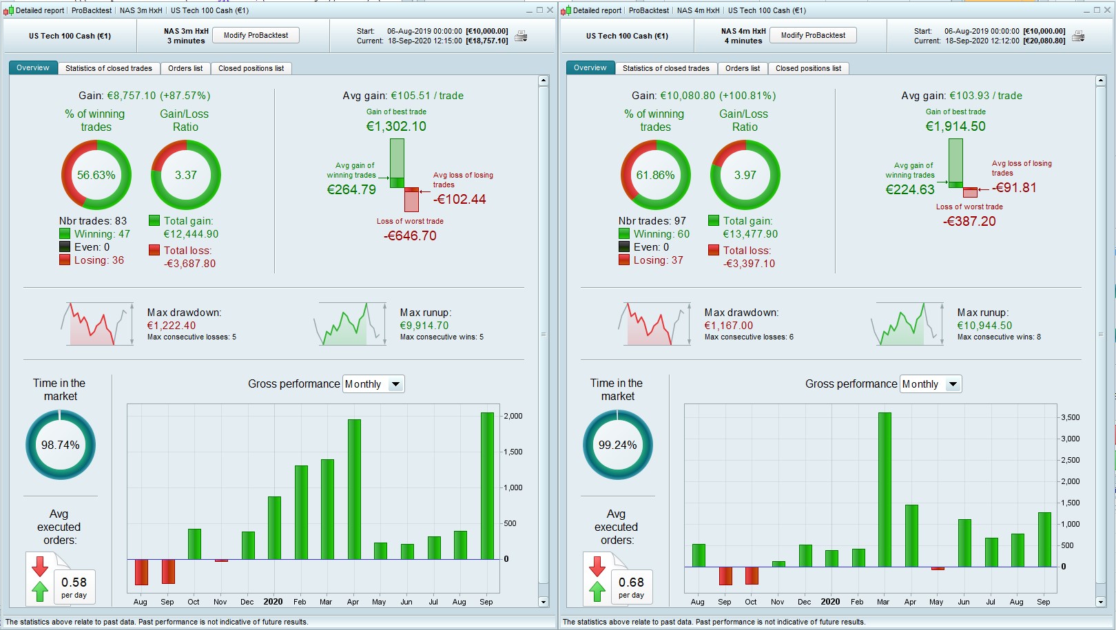 Attached are backtests for 4min and 3min versions, both of which appear to be profitable over the past year. Position size = €1