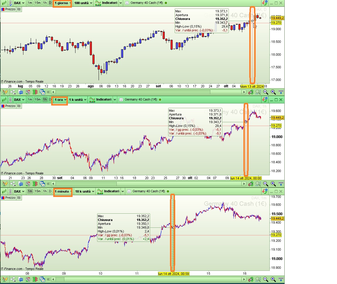 Ovviamente se metto il mouse sulla barra giornaliera, la corrispondente barra di un timeframe più piccolo sarà la prima di quel giorno.