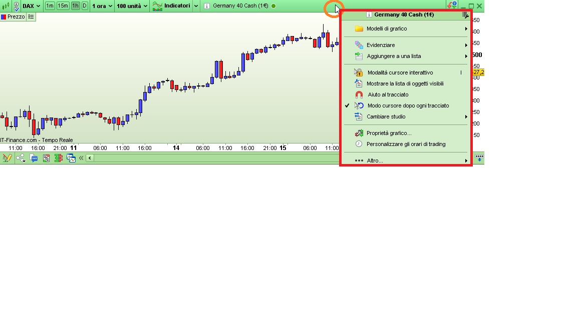 - come da foto X1 clicca in un punto vuoto della barra in alto del grafico (vedi freccia nel cerchio Arancio) e ti si aprirà un menù (riquadro Rosso)