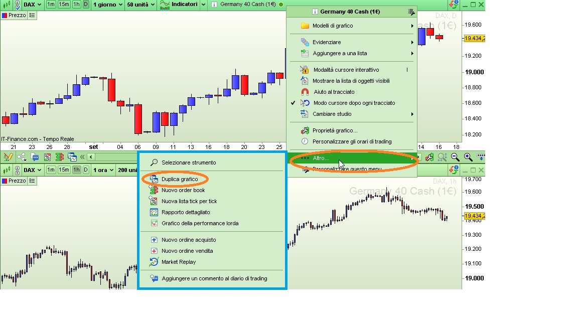 - come da foto X2, a quel punto scelgli la voce ..ALTRO e ti si apre un ulteriore menù (riquadro Azzurro), dove dovrai selezionare DUPLICA GRAFICO (ellisse Arancio).