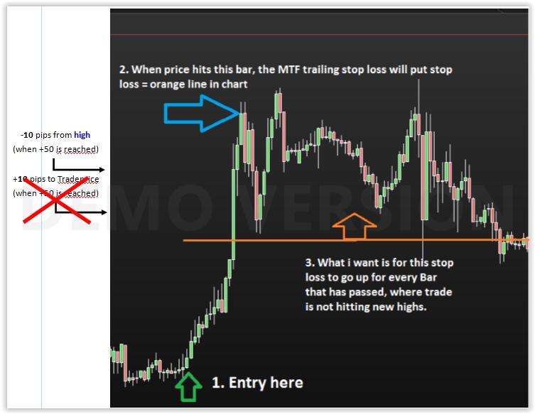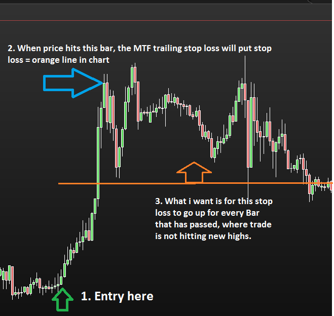 The idea is that If tthe market continues to rally up, the stop loss will follow the price higher and higher, as is normal with the MTF trailing stop loss today. But if the market stops rallying up andf starts moving sideways the market MIGHT come crashing down. Lets say it goes sideways for 15 bars before crashing down. I would love my stop loss to not be 50, but maybe 70 by that time..