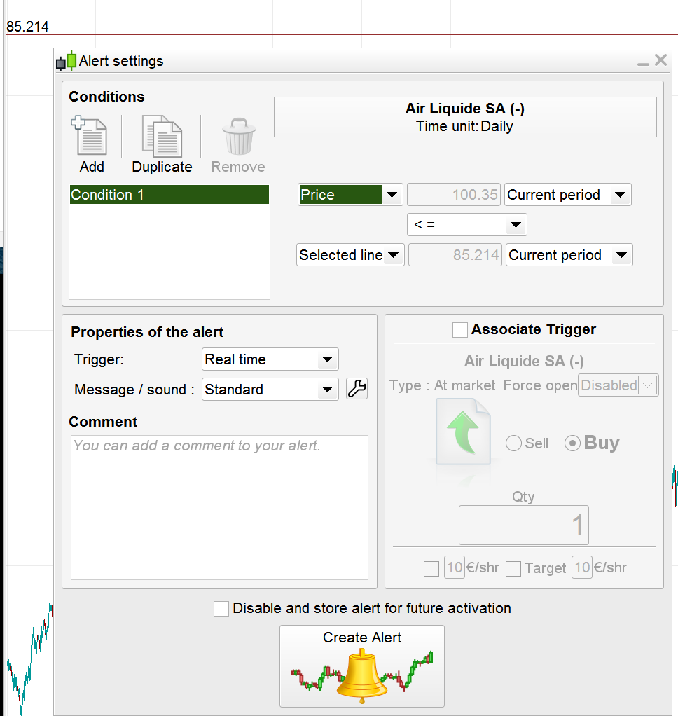 You can add an alert on a custom line, just by clicking the right mouse button on it and choose “create alert”. A new popup will appear like the one in the attached picture.