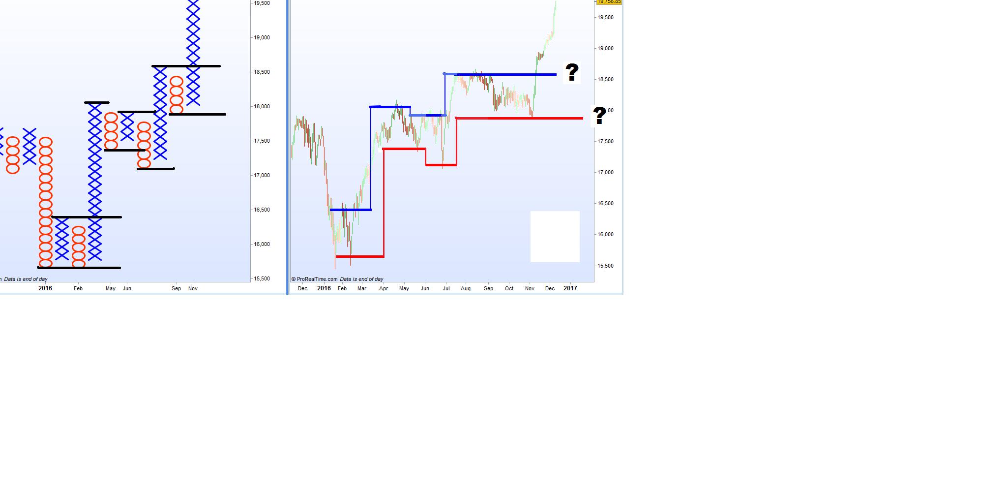 No, I’m not talking about the built-in Renko charts (I think it is not possible to code a trading strategy with these, because there is no Renko command in the indicator list for backtests). But I programmed my own Renko charts (in the end totally identical to the built-in charts), and a trading system using the condition : Turn a position from long to short or from short to long after 2 Renko boxes have appeared in the other direction of the open position at the close of a bar. This is precisely defined, and in principle, there are only 2 variables : The borders of the very first Renko box at the beginning of the chart and the box size. It turned out that the result of this system at a fixed box size depends entirely on the position of the first box, as this fixes the borders of all other boxes for all times. So, Dax close 10.000 in the first bar gives a totally different result than, say, DAX close 10.001. Therefore, Renko charts cannot be used for trading, I think, although they look optically so good. It is all chance.