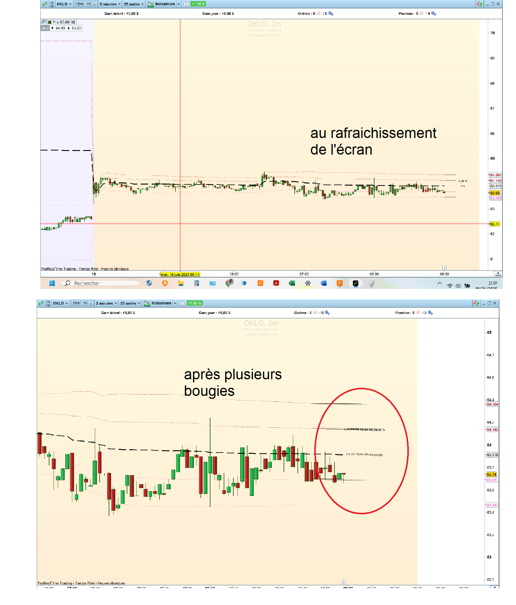 voici le code et 2 images : la première après le rafraichissement de l’écran (reload), l’autre après quelques bougies.