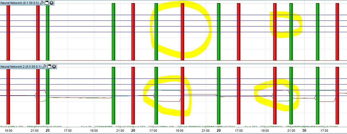 Well… For me look normal. The Neural Network learns and make the prediction. My indicators and your indicators provide signals and the adgoritm has found a correlation.
