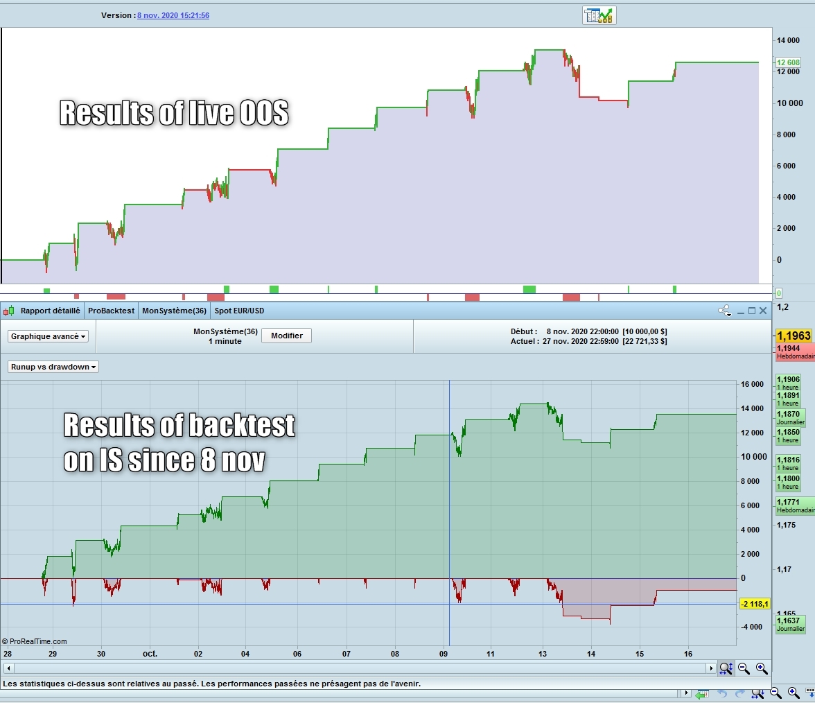 As you see OOS results on Live since 8 november are quite the same that backtest on IS since 8 novembre