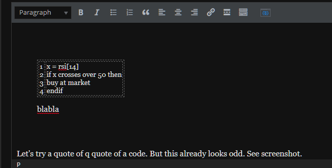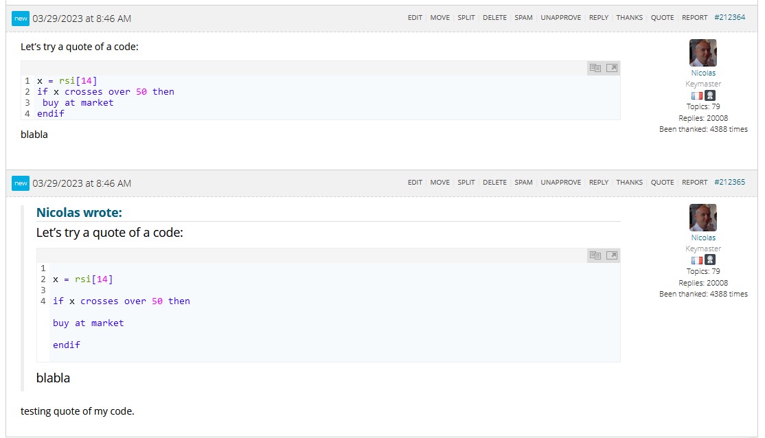 - In the one situation I tried the past days, I was unable to quote from a post with a Code (the blue button) in it; whatever I tried I could not manage to get in the code within a quote, also not when I typed in the code newly (instead of copy-paste etc.).