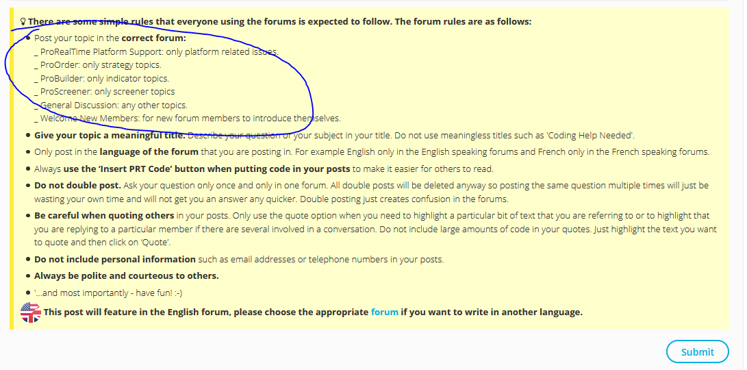 I move your topic from the probuilder forum (for indicators ONLY) to the proorder forum (for backtests and automatic stategies). You can find the posting rules in the yellow box just above the submit button for future reference (see screen capture attached). Thank you.