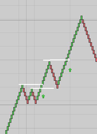Understood, thanks. Another idea – what about using a normal renko chart and drawing a horizontal line across from the peaks. Maybe only have the lines shown is n green bricks have printed in succession, to prevent whipsawing. Arrow to mark a buy signal, like so (attached).