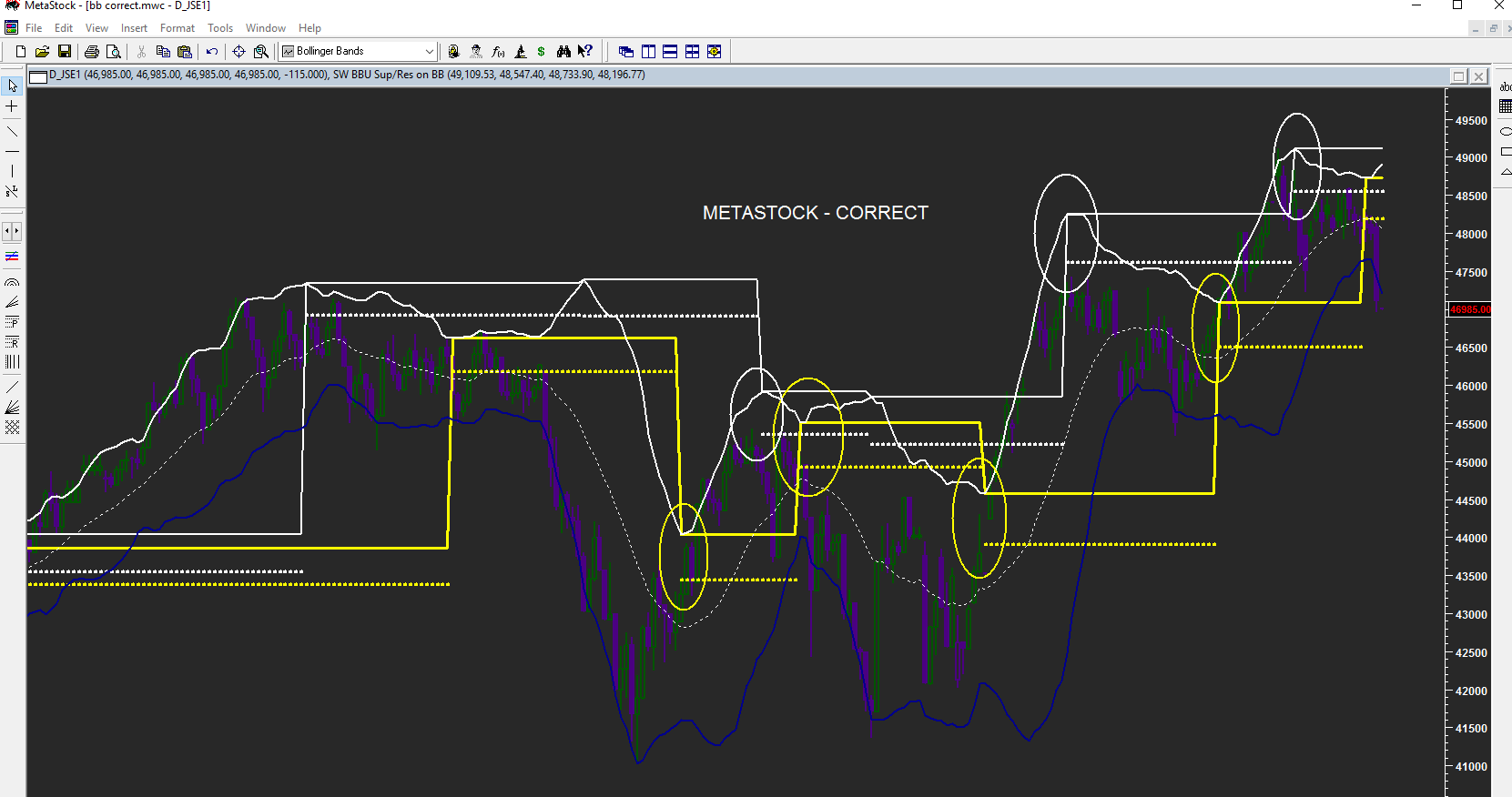 1. Plotted the upper BB in white (the lower is in blue – ignore)