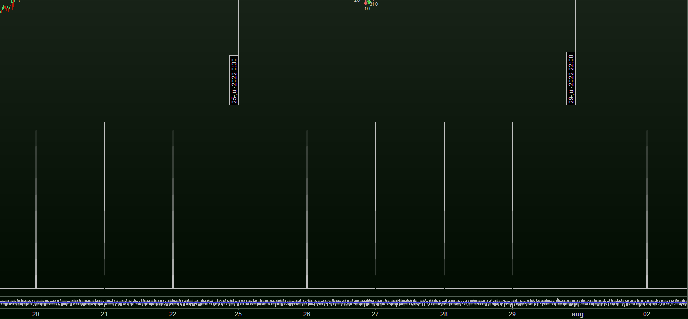 The 2nd attachment shows that the 00:00 time nicely shows as I expected : at bar 23:59 (this is a 1 minute chart). Thus indeed, once you have a bar prior to the opening, the opening can be captured because it is the closing of the prior bar triggering that. On Sundays no prior bar and in any normal index situation, also no prior bar at the opening (occurring each day).