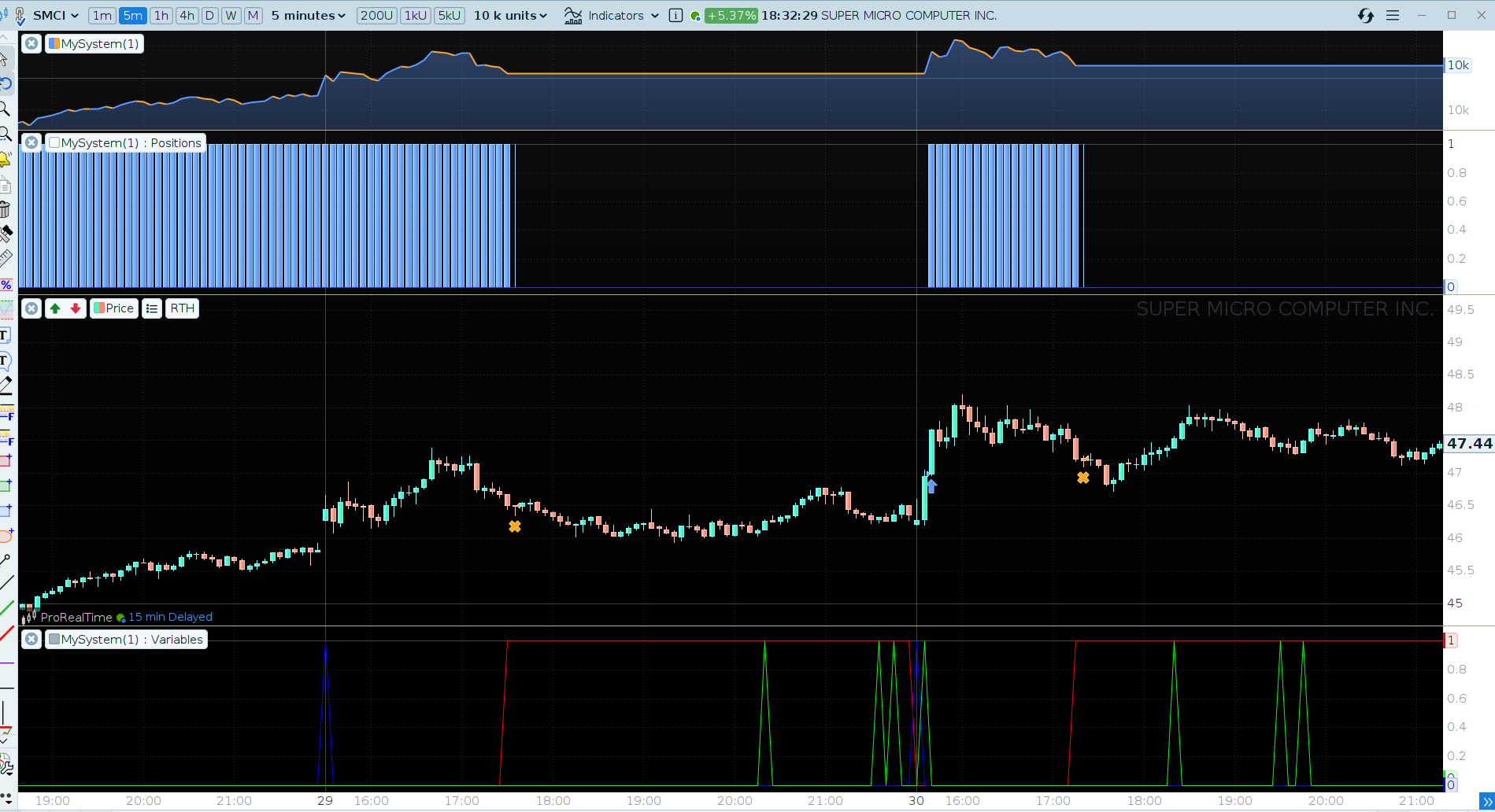 // Exit: close crosses below 30-period average