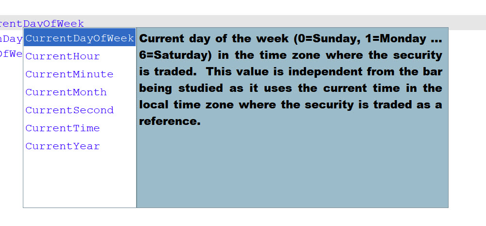 - at 22:00 UTC+0 both DayOfWeek and OpenDayOfWeek (or CurrentDayOfWeek) return the same value (0=sunday, 1=monday,…)