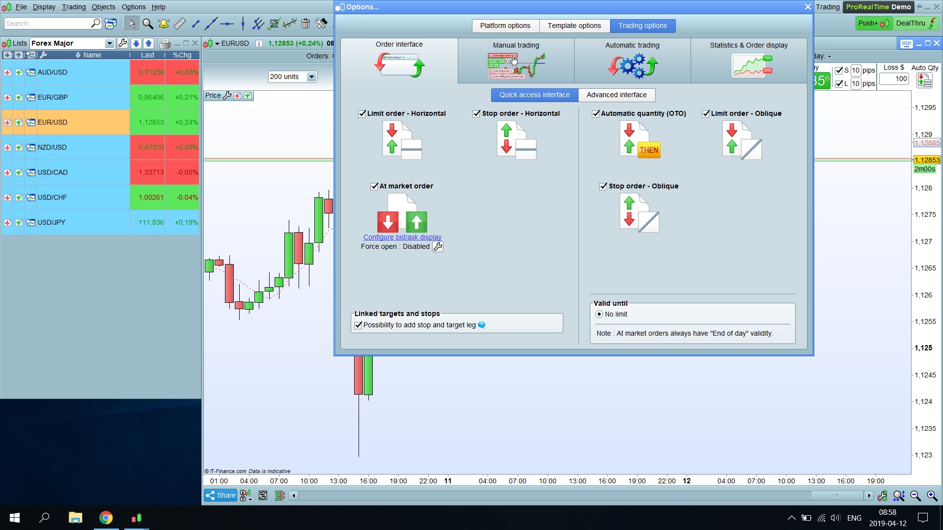 Prorealtime with IG, I’m not aware its different elsewhere, but if so then so be it, but for OCO order which are not available still, you can simply put 2 orders on the chart and when one kicks in the delete the other, it’s just a manual way of executing the OCO order, so obviously you need to be either watching the charts or setting alerts for you to respond, timeframe an dlevels dependants with volatility thresholds of course, but usually youcan have time to respoond, and whats the worst that can happen, you enter one way, if the other order is kicking in then the trades going the wring way and you are essentially pausing the trading with a hedge, just set the orders to force open, or of course you set to net off then it will act as a stop… depends how you trade I guess, some people like to trade themselves out, but no reason why you can’t do it manually as the other just acts as a stop if you put both to force open or net off, I’ve not tried a net off order opening a new trade mind, but I suspect it would just open normally..