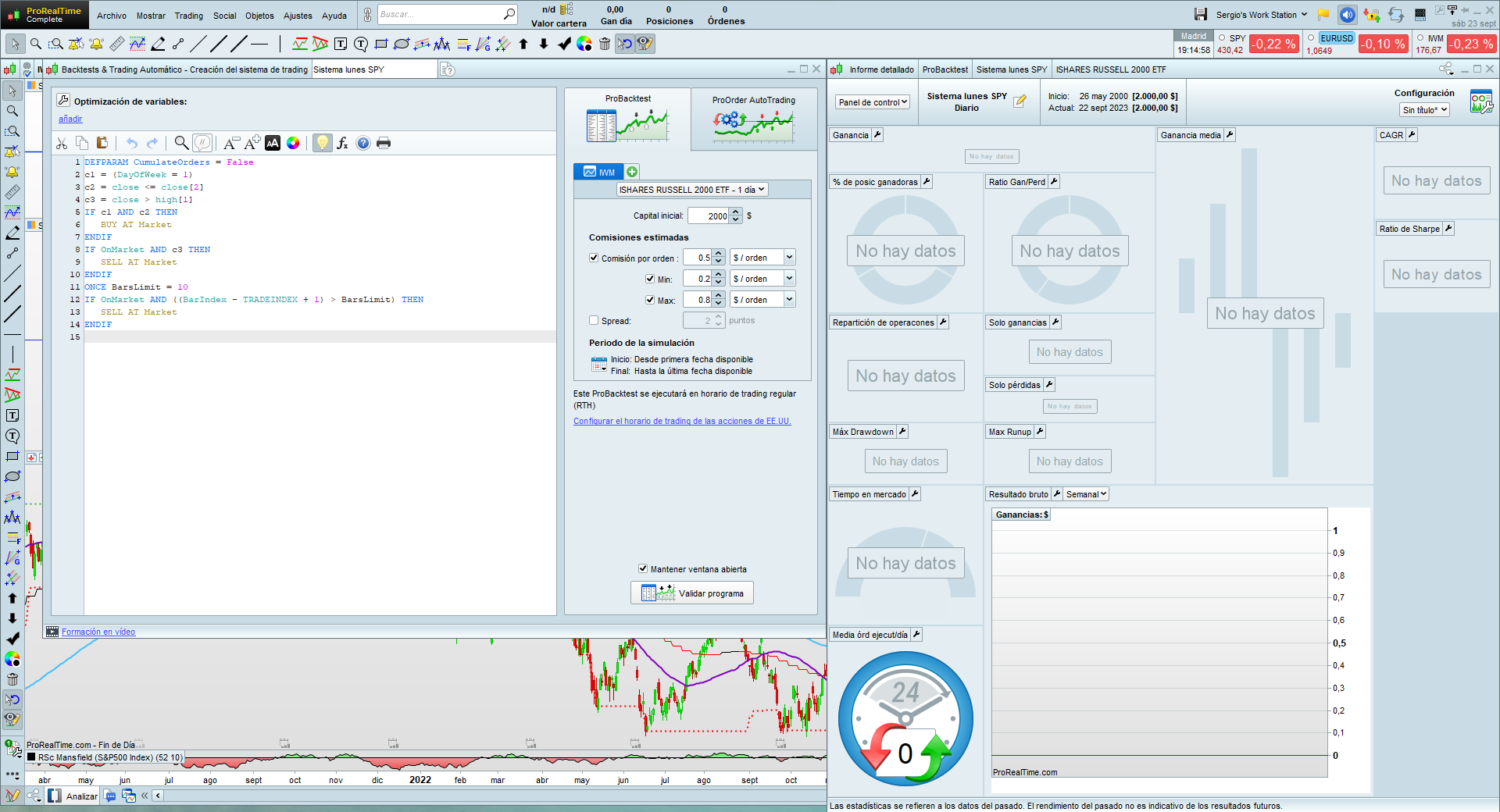Quiero programar el siguiente sistema para hacer backtest pero al hacerlo no me arroja ningún dato. Soy novato en este lenguaje y no encuentro que estoy haciendo mal, os adjunto captura del código y también como es el sistema, muchas gracias. Es un sistema muy sencillo solo de largos en el SPY: